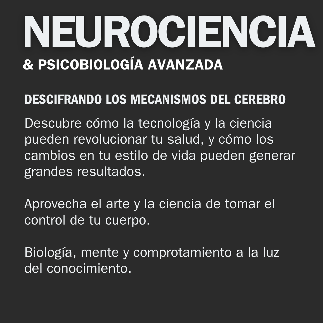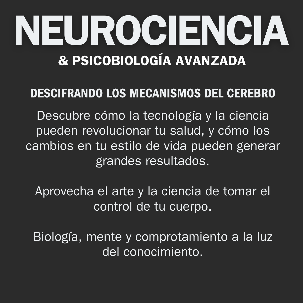 Este estudio de Neurociencia y Psicobiología está destinado a expandir la comprensión sobre el comportamiento humano, ofreciendo claridad y profundidad a muchos conceptos de uso común. Pudiendo integrar así perfectamente esta información con tu vida diaria y a cada labor que realices en tu desarrollo personal como profesional.